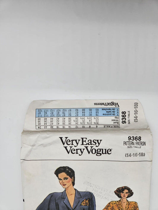 Very Easy Very Vogue Pattern 9368 Miss Size 14, 16, 18 Vtg 1980s