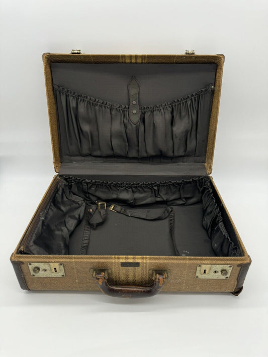 Vintage 1930-40s Striped Suitcase By Crown W/Leather Trim