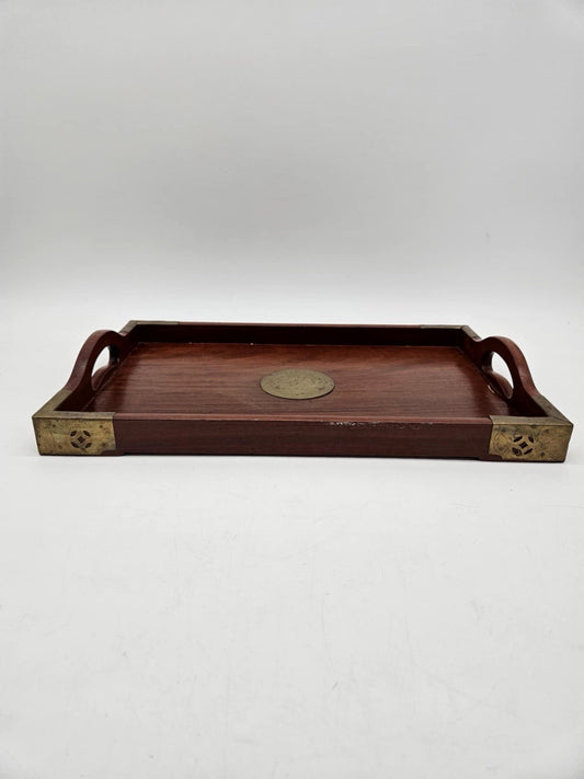 Vintage Asian Cherry Wood Serving Trays w/ Brass Medallion & Corners
