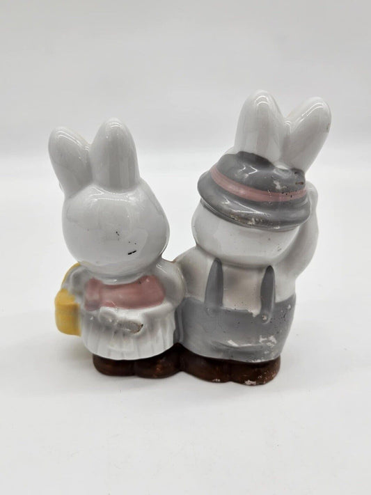 Vintage Figurine Bunny Rabbit Couple Pink Grey Hat Bow Basket Made in China GOT