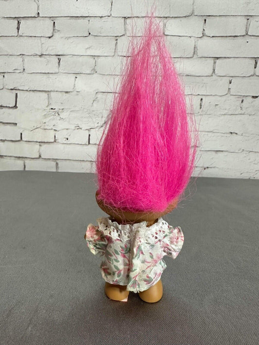 Vintage Russ Troll Doll Wearing Floral Dress With Pink Hair VTY