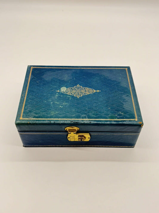 Blue Vintage Jewelry Box - Brass Latch - Leatherette Exterior - Velvet Interior