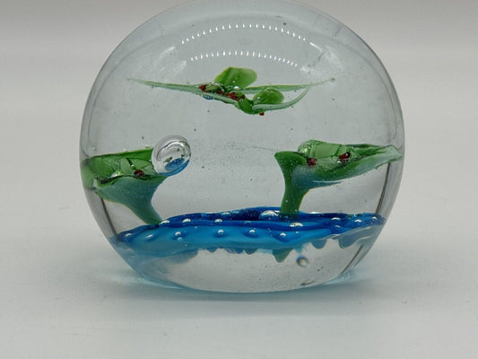 MURANO HAND MADE ART GLASS PAPERWEIGHT BLUE WITH GREEN BIRDS AND FROGS