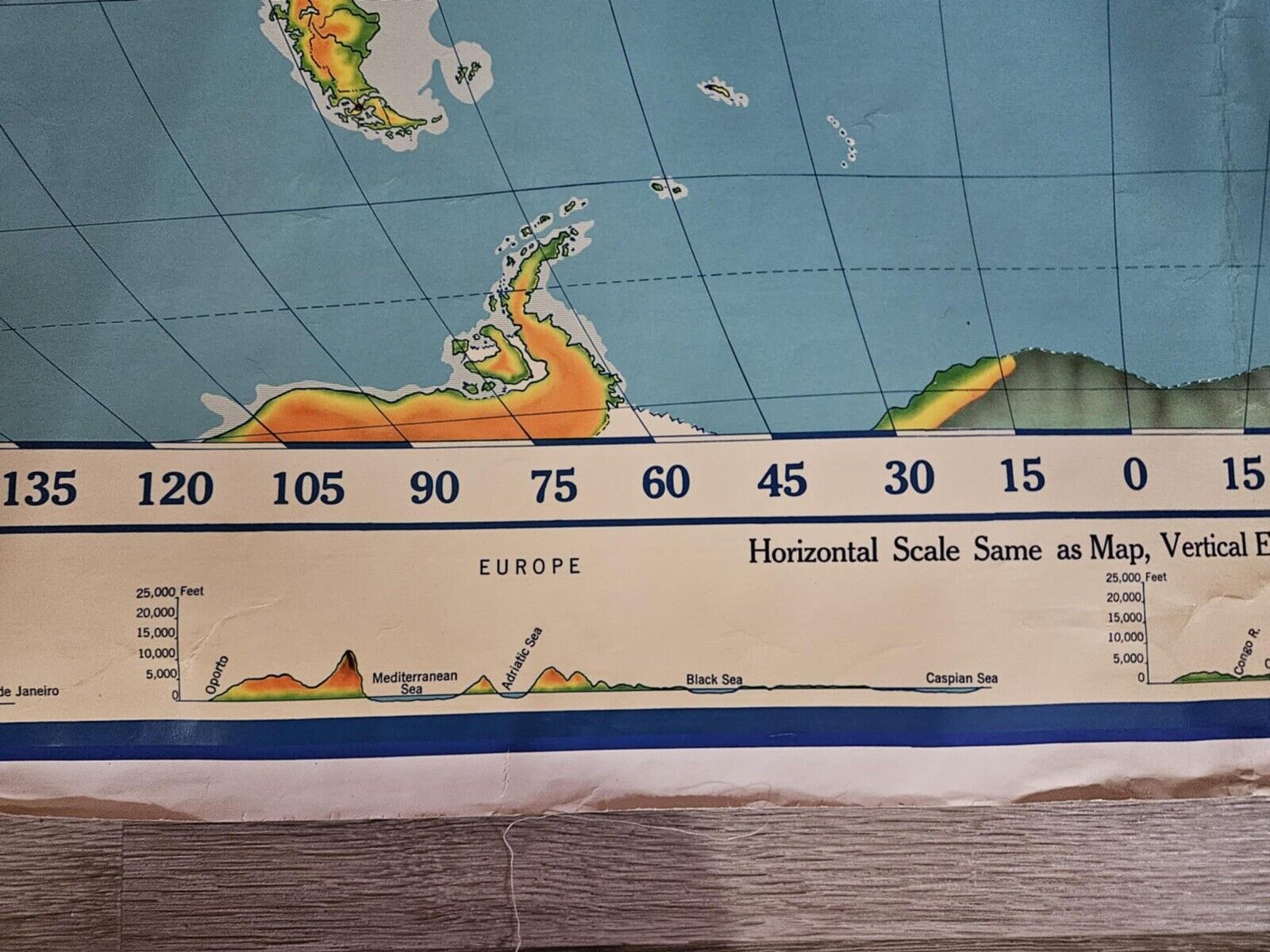 1960 A.J. Nystrom Pictorial Relief Map of the World with merging colors PR98. Shipped with USPS Ground Advantage.