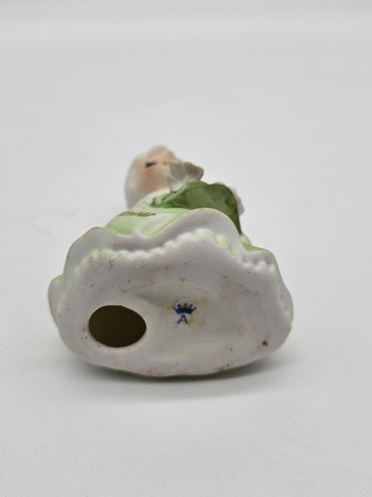Adorable Vintage Lefton Green December Birthday Girl With Flowers 4”