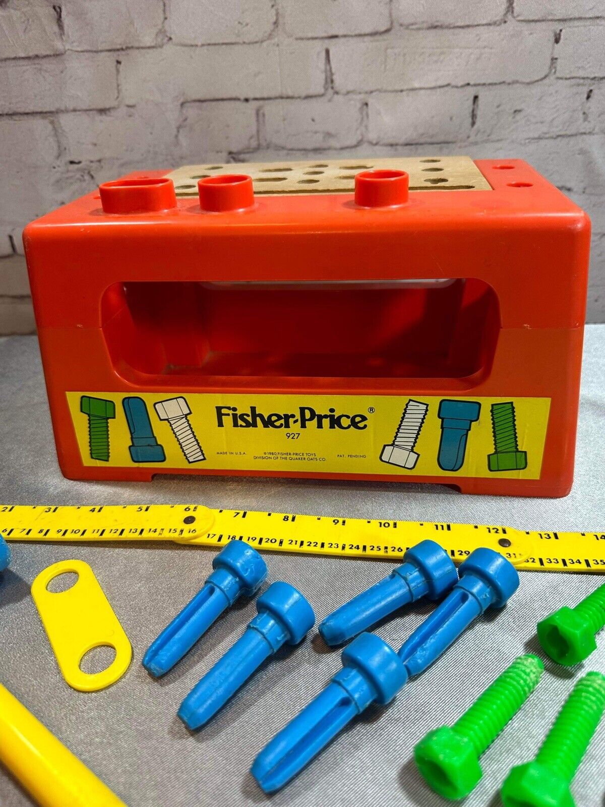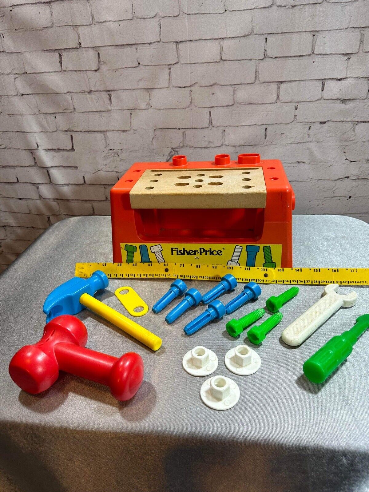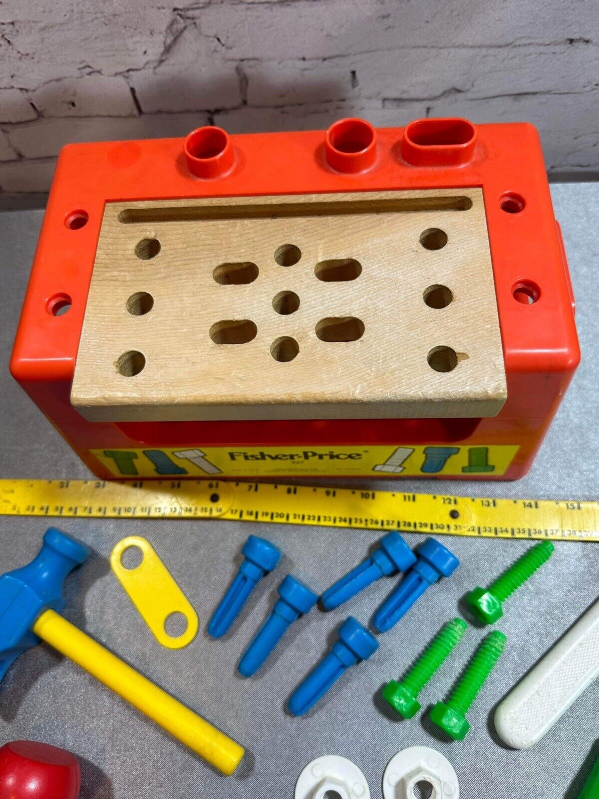 Fisher Price # 927 Wood Plastic Work Bench With Tools Ruler Hammer 1980 VTY FNF
