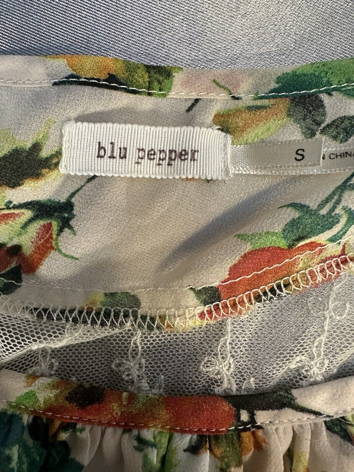 Get ready to turn heads with this stunning floral dress by Blu Pepper in size small. The delicate flowers in the pattern add a touch of femininity to this sleeveless dress, making it perfect for any occasion. The dress is tailored to fit women and is comfortable to wear all day. The dress is versatile and can be paired with a variety of accessories to give you the perfect look. Whether you are headed to a party or just running errands, this dress will make you feel confident and beautiful.