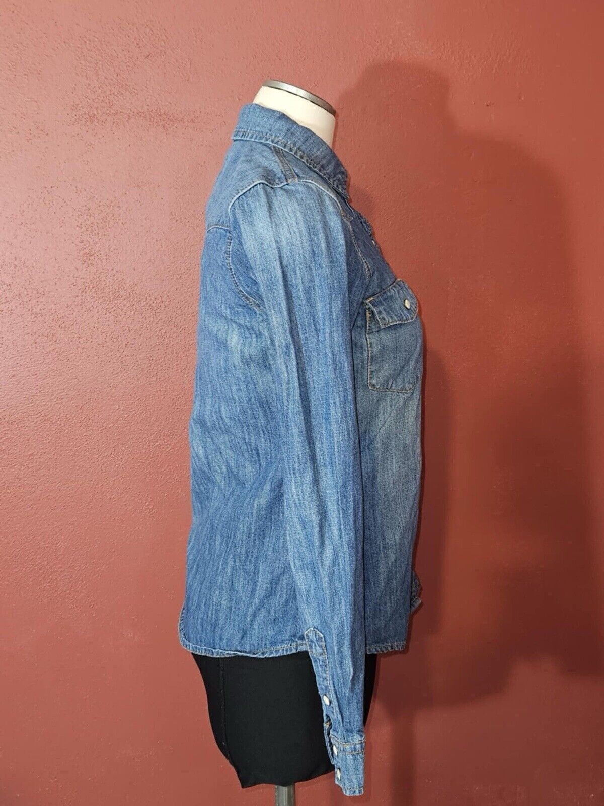 Forever 21 Denim Shirt Womens Size Small Blue Pearl Snap Long Sleeve Western