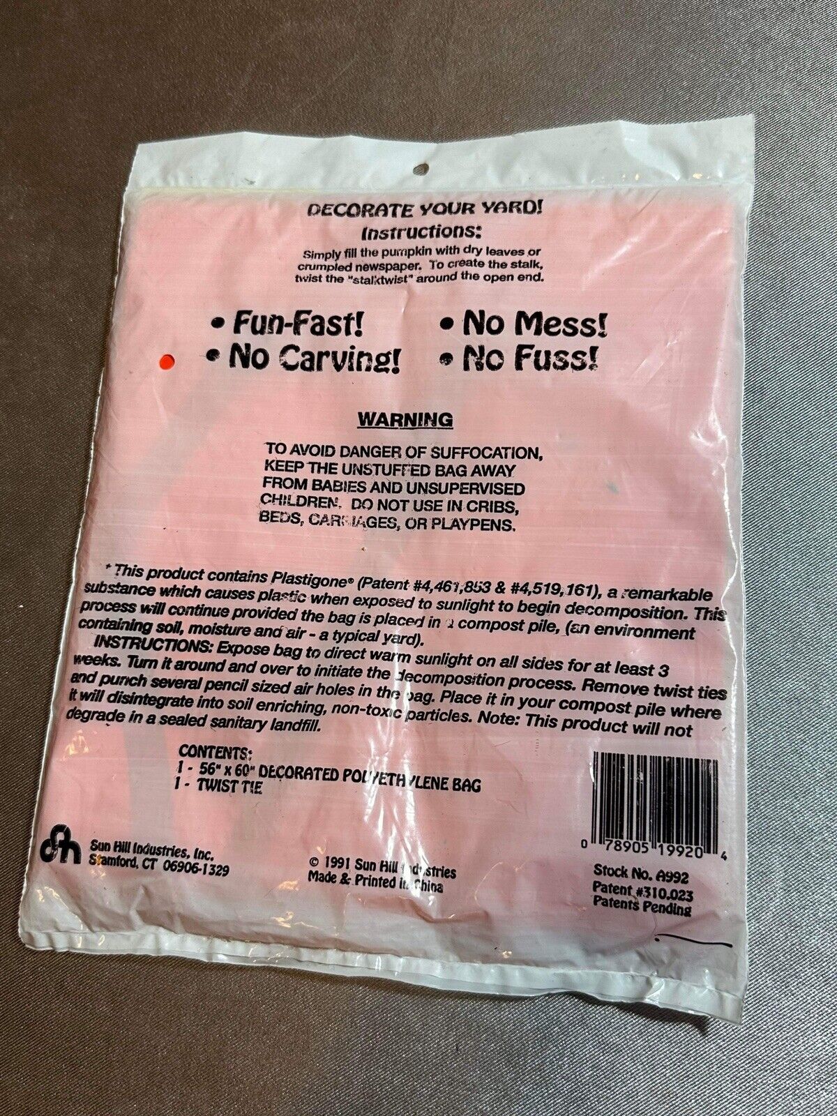 Giant 1990 Vintage Stuff-A-Pumpkin Halloween Lawn Leaf Bag Jack-O-Lantern TNO