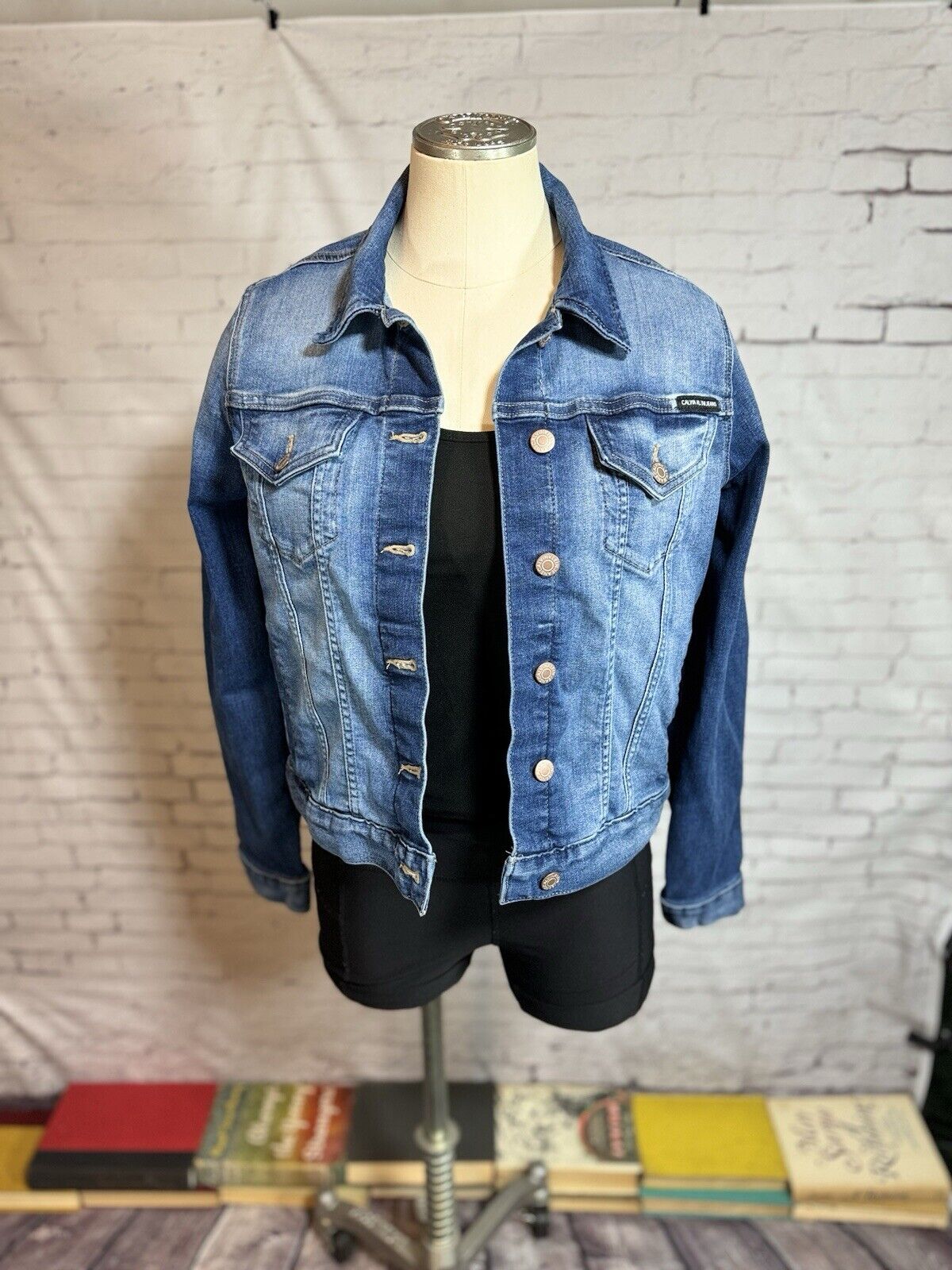 SZ SMALL Calvin Klein Jeans Jacket Women's Blue Denim Trucker Stretch WCLTH. Condition is Pre-owned. Shipped with USPS Ground Advantage.