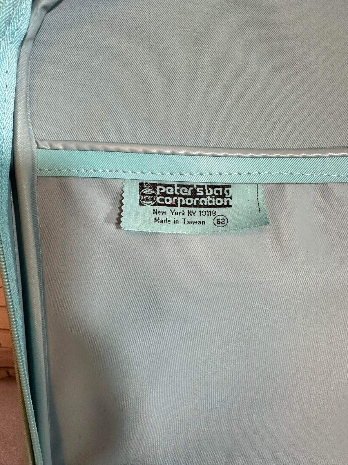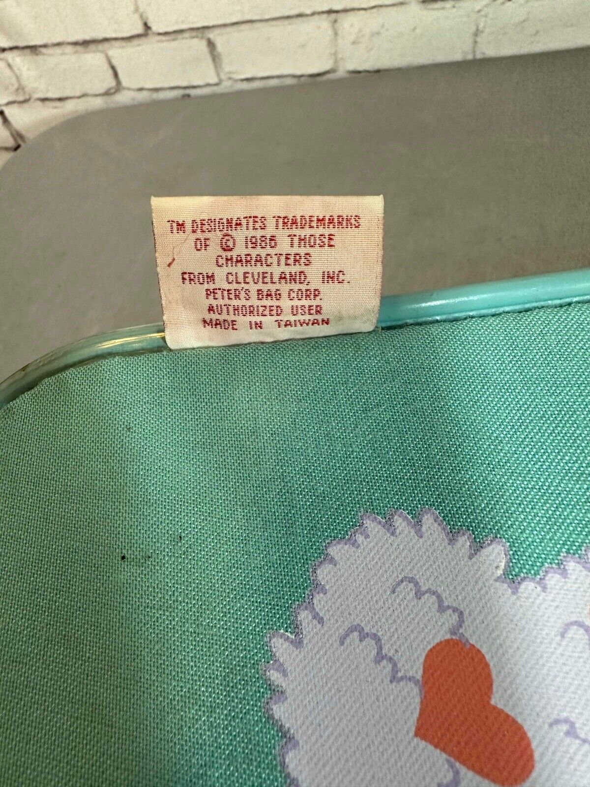 This vintage Care Bears suitcase in blue is the perfect addition to any collection. With a beautiful setting sail design, it's sure to catch the eye of any fan of the beloved TV show and franchise. The fabric/canvas material provides durability for all your travel needs. Measuring 16 inches in length, 10 inches in height, and 4 inches in width, it's the ideal size for carry-on luggage or as a decorative piece. The suitcase was manufactured in Taiwan in 1986 by Peter Bags Corp, making it a unique and rare find.
