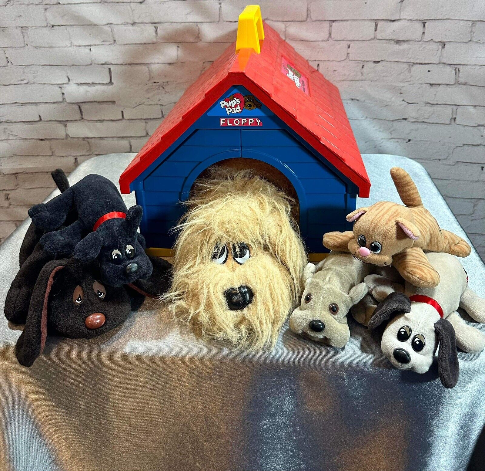 Vintage LOT 1980s Pound Puppies Dog House, 2 Lg Dogs, 3 Sm Dogs + Pond Kitty