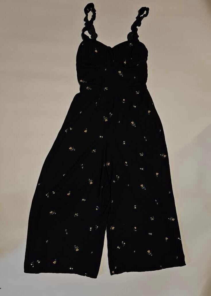 WOMENS FLORAL SLEEVELESS CROPPED PANT SIDE ZIPPER MOLDED CUP JUMPSUIT, BLACK. Condition is Pre-owned. Shipped with USPS Ground Advantage.